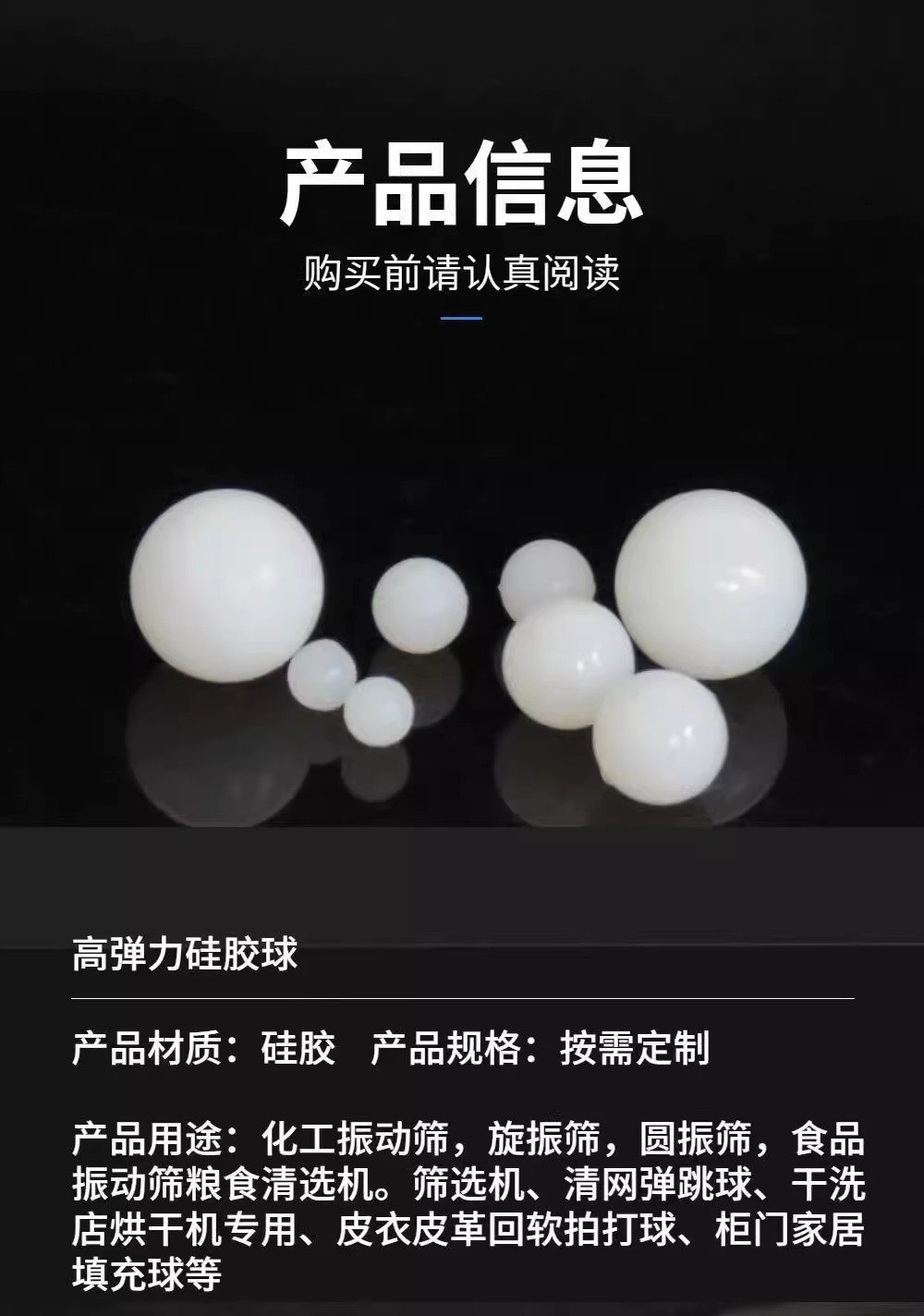 安裝在旋振篩的沖孔板與篩網(wǎng)之間,當(dāng)旋振篩工作時(shí),硅膠球利用自身的彈力和重量,隨著篩體的振動(dòng)而產(chǎn)生跳動(dòng),不斷地撞擊篩網(wǎng),使粘在或卡在篩孔之間的物料被拋起并落下,從而實(shí)現(xiàn)清網(wǎng)功能,提高物料的透網(wǎng)率和篩分效率。 應(yīng)用領(lǐng)域 廣泛應(yīng)用于食品、醫(yī)藥、化工、礦產(chǎn)、機(jī)械、金屬冶金等行業(yè)。例如在食品行業(yè)篩分面粉、糖粉等物料時(shí),硅膠球的環(huán)保特性可確保產(chǎn)品不受污染;在醫(yī)藥行業(yè)篩分藥品顆粒時(shí),能保證藥品質(zhì)量安全。 外觀特點(diǎn) 硅膠球通常為乳白色的透明或半透明球體,外表光滑圓潤,手感適宜,彈性好,韌性足,這種外觀特性有助于其在篩網(wǎng)間順暢跳動(dòng),同時(shí)也便于觀察其磨損情況,及時(shí)進(jìn)行更換。